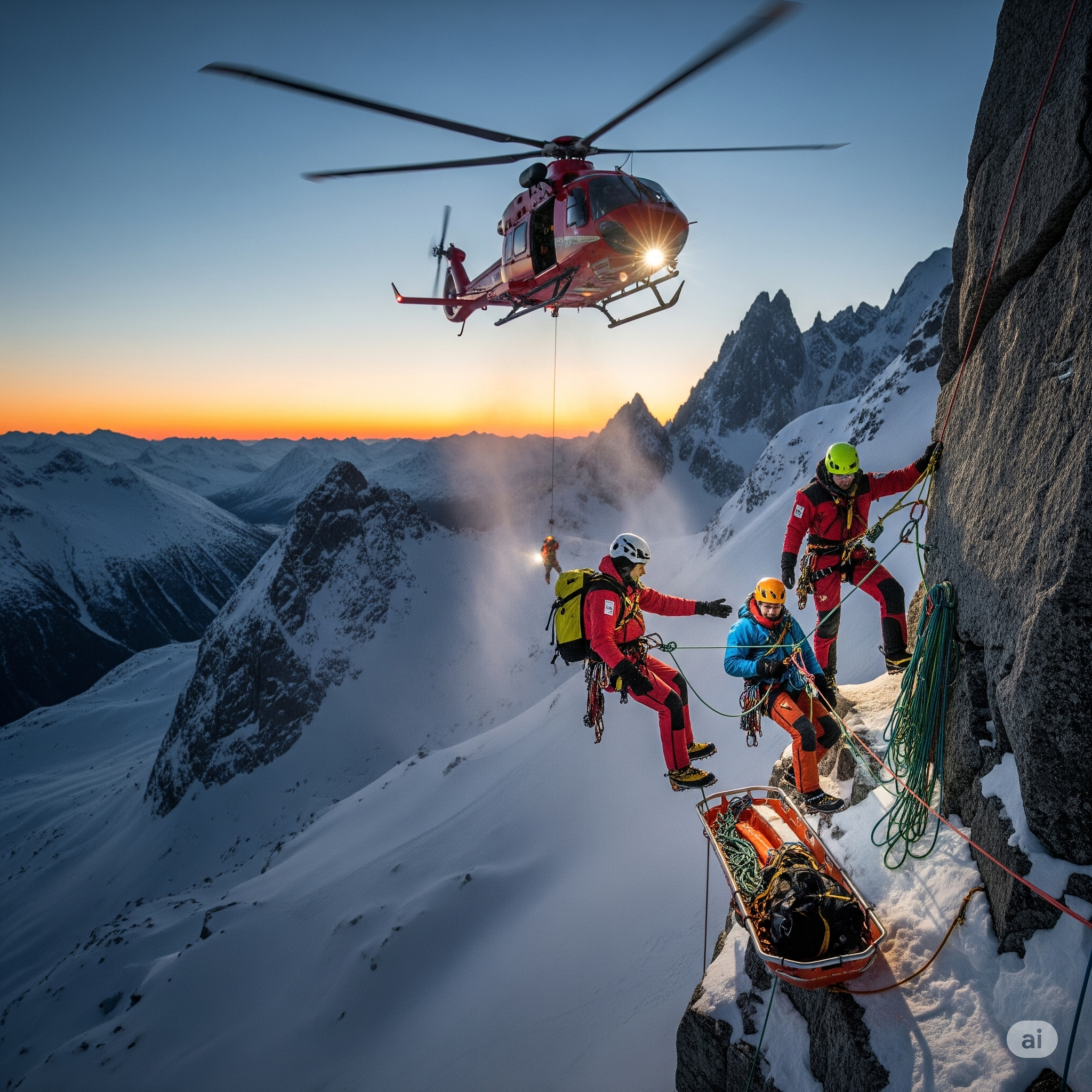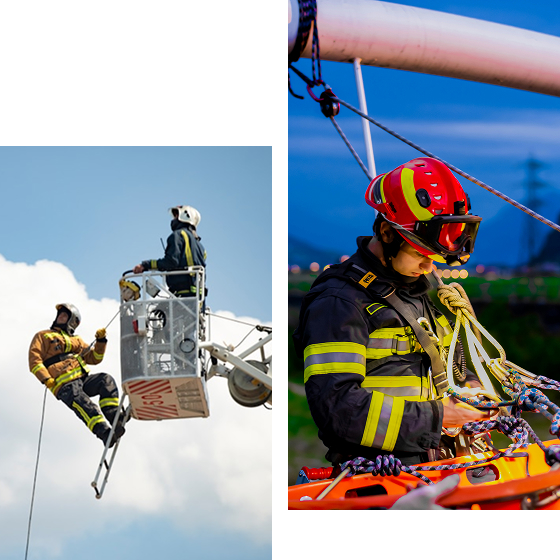 Of course, there is also special equipment for the members of the high-altitude rescue team, which includes a 5-point harness, a climbing helmet, gloves, abseiling devices, safety devices and a personal radio.
